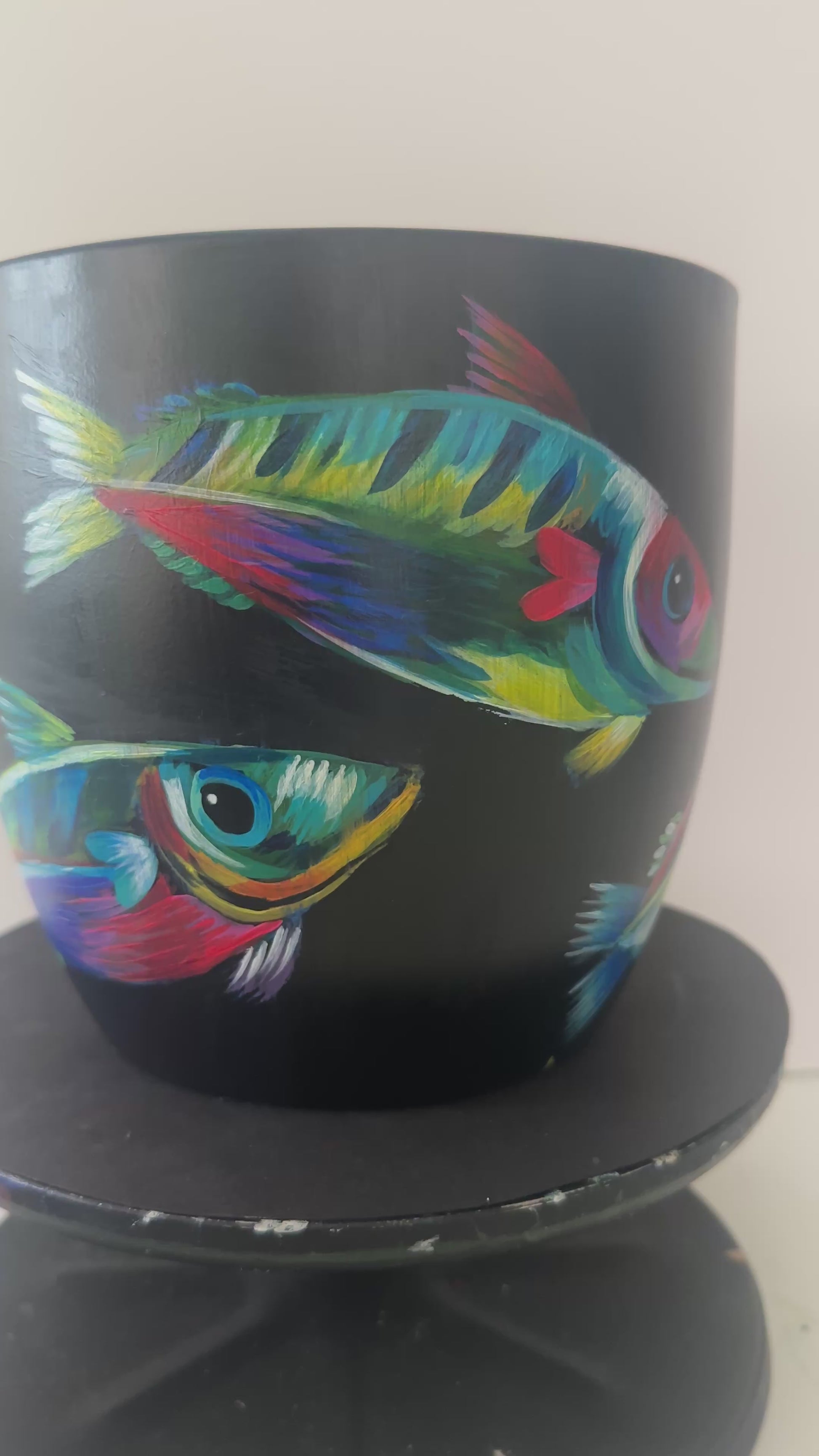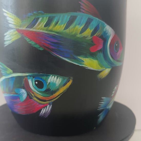A sleek and elegant hand painted pot featuring a glistening shoal of 5 colourful fish gliding through a deep black sea. Brightly decorated with flashes of red, orange and yellow, making this fish pot pop playfully. A pretty green rim finishes off the pot colourfully.