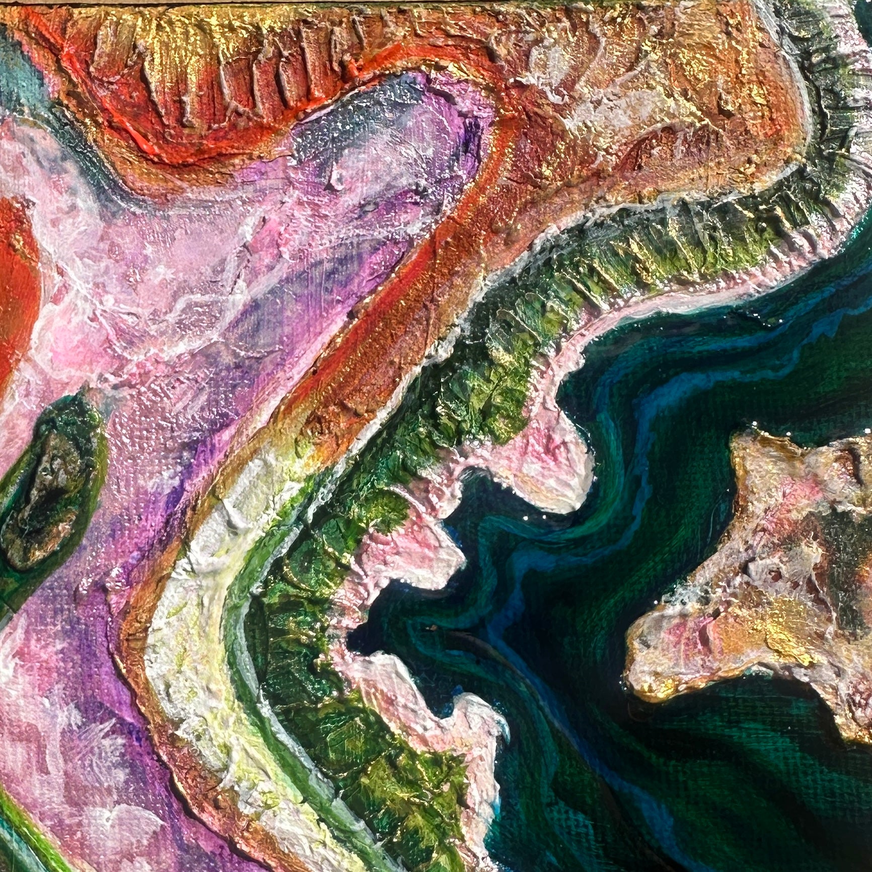 A collection of nine 10x10 cm original acrylic paintings inspired by the textures, colours, and quiet power of the land. Each painting holds fragments of earth, sea and fire - glistening surfaces captured in resin and rich, earthy colour.