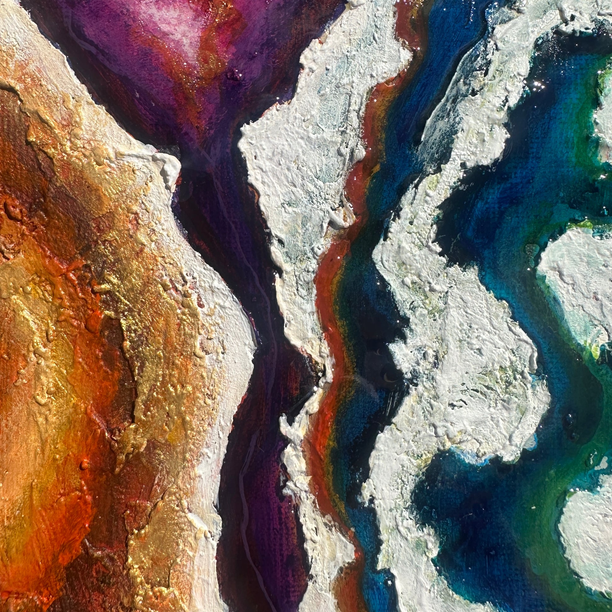 Fine art print of ‘Agate Delta’ from The Earth Thread series. Rich purple tones carve through rugged glowing coastlines.