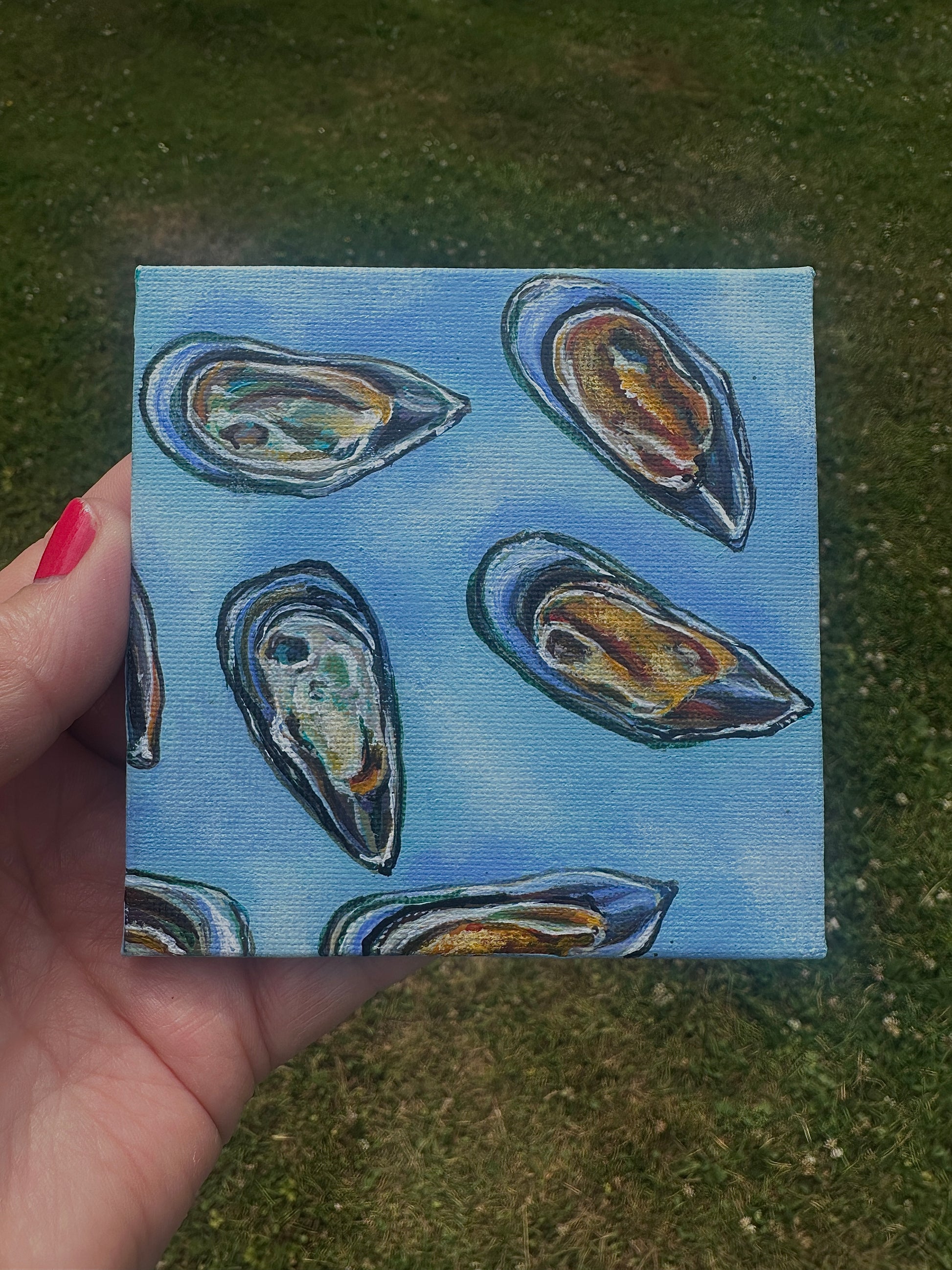 Five oysters float in a pale blue glow — cool, quiet, and ethereal. This print feels like a memory caught in a pool of morning light.