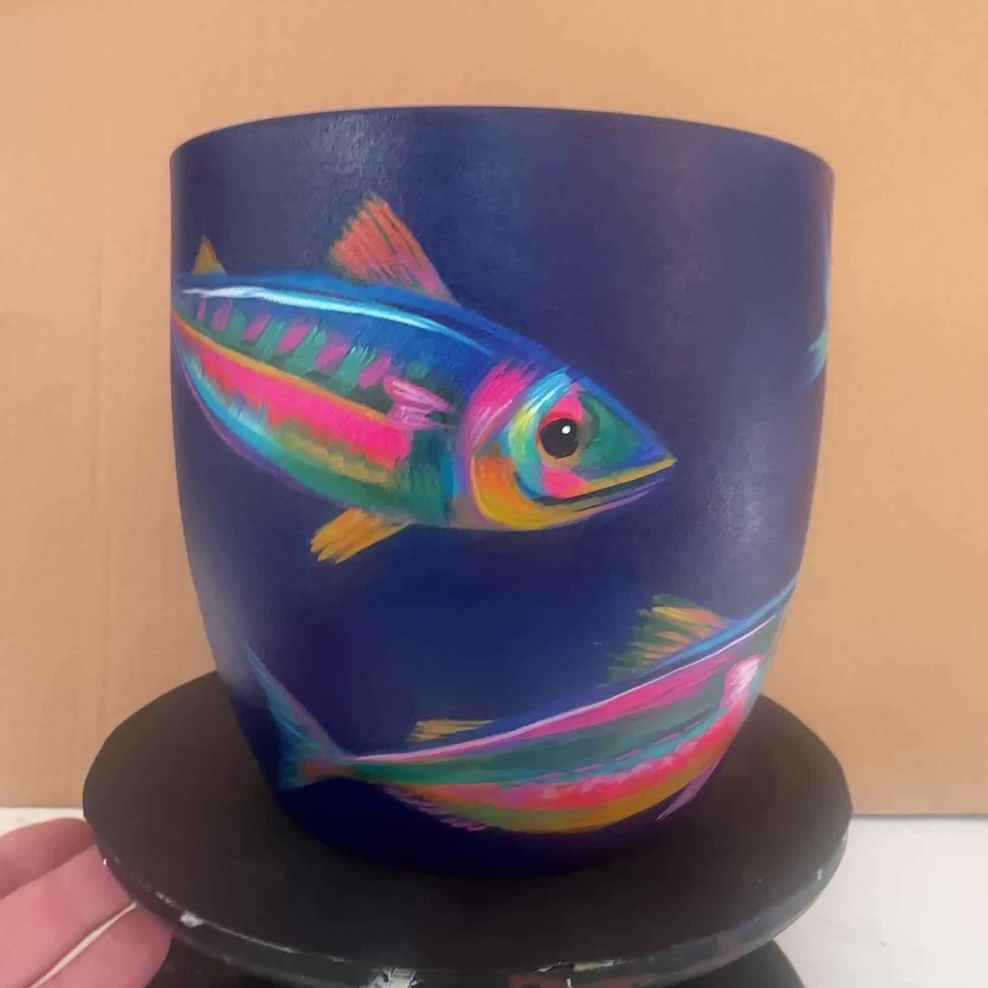 Luminous fish dart against a rich dark blue background. Electric pinks, turquoise, and gold create a lively, tropical feel; each fish painted with joyful, colourful detail. Inside, the pot has a bold pink interior, with a dark blue rim.