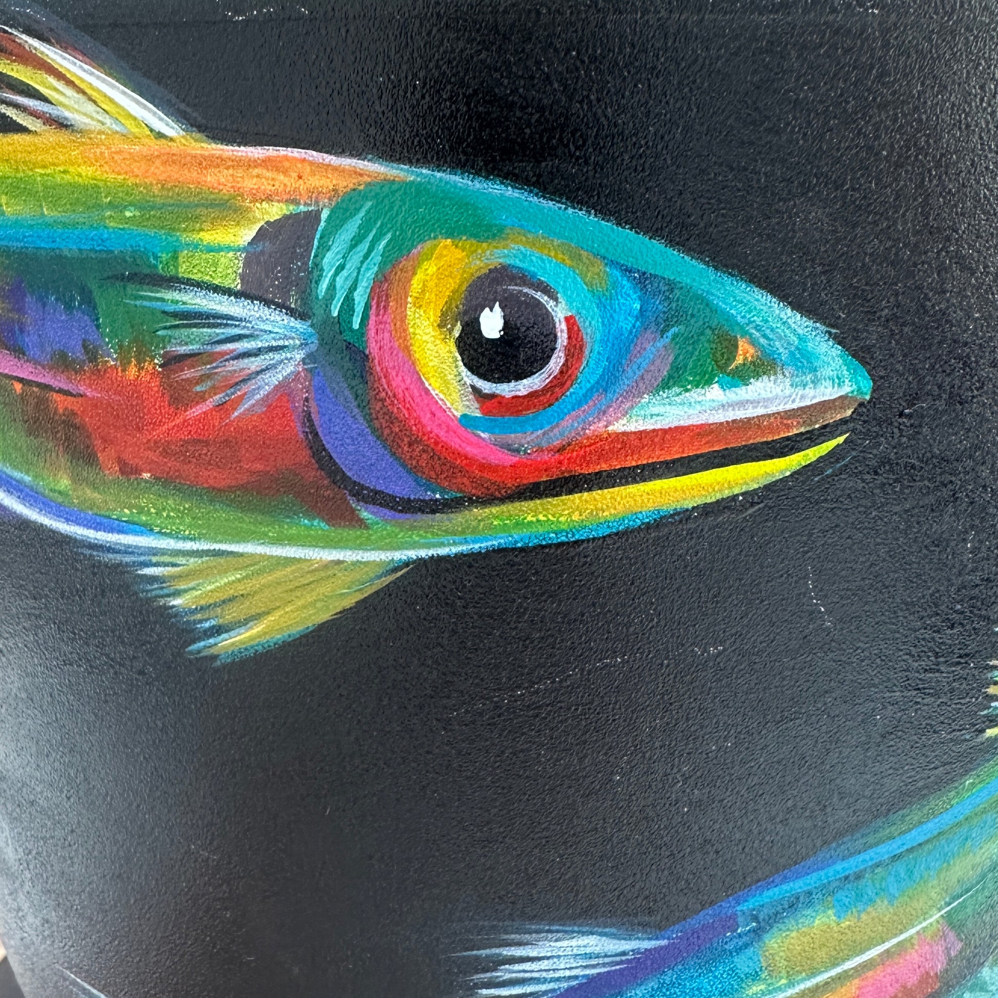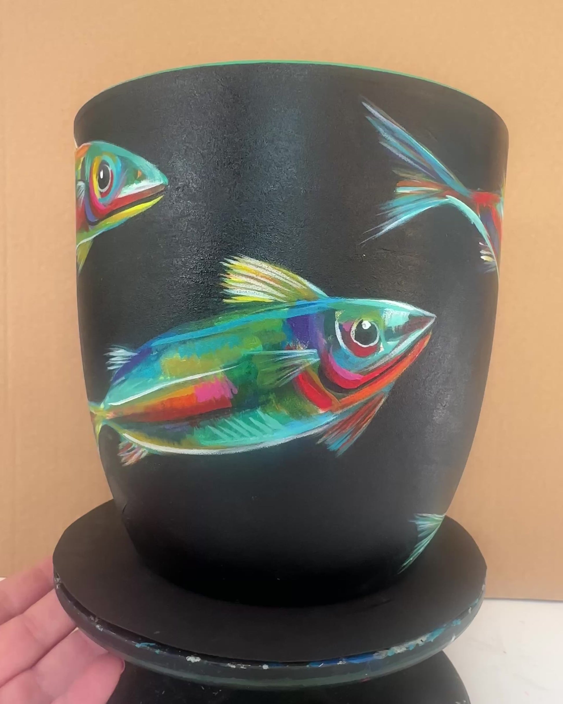 A radiant *Little Shoal* creation, this pot captures the energy of a lively shoal swimming through midnight waters. Against the deep black background, flashes of turquoise, emerald, and gold ripple across each of the 6 fish, creating a sense of constant movement. The turquoise interior and green rim frame the piece with fresh coastal tones, harmonising perfectly with the fishes’ vivid colours. Protected with a clear varnish for lasting beauty.