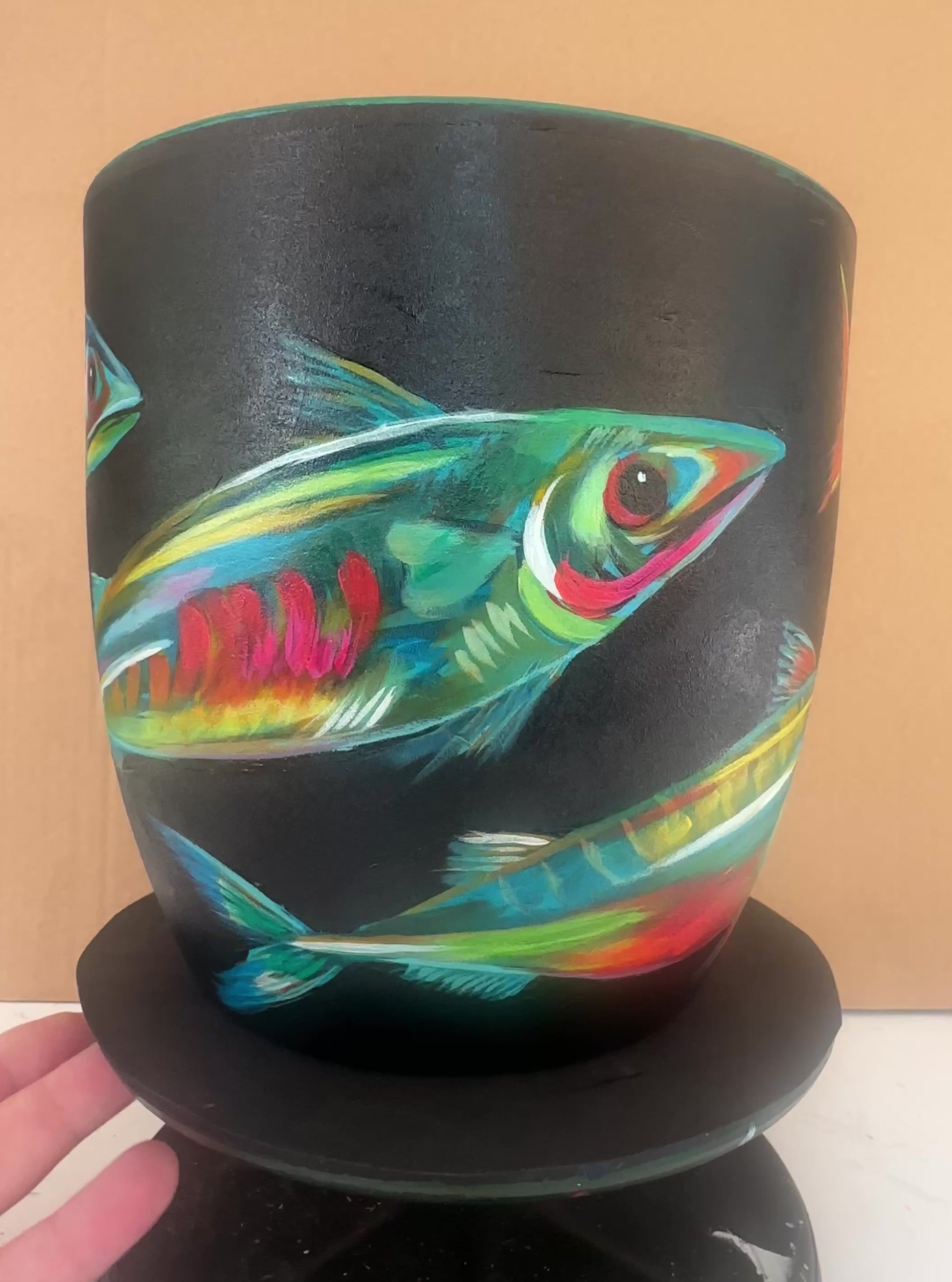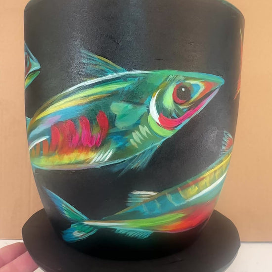 A striking *Little Shoal* pot where brilliant, multi-coloured fish flash like jewels against a deep black sea. Emerald greens, turquoise blues, and yellow highlights shimmer across each fish, their movement heightened by the dark background. Inside, the pot glows with a rich turquoise interior, while the rim is painted a fresh green that echoes the luminous fins and tails of the shoal. Finished with a protective varnish for a soft sheen, this piece brings the vitality of the ocean into any space.