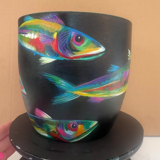 A bold and colourful pot with a shoal of five multi-coloured fish flashing against a deep black background. Emerald greens, vivid pinks, and golden highlights shimmer with energy, each fish painted with careful detail. The turquoise interior and green rim complement the shoal’s colours, giving the piece a balanced, coastal freshness. Sealed with a protective varnish for a lasting finish.