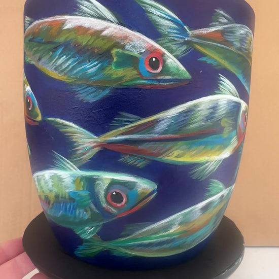 An abundant shoal of eleven fish glides through the depths of a dark blue sea, their patterns painted in earthy greens, muted golds, and shimmering silver. Each fish catches the light differently, giving the pot a quiet, tidal rhythm. The cool green interior brings freshness, while the silver rim mirrors the fish’s metallic tones. Finished with a protective varnish for a gentle sheen.