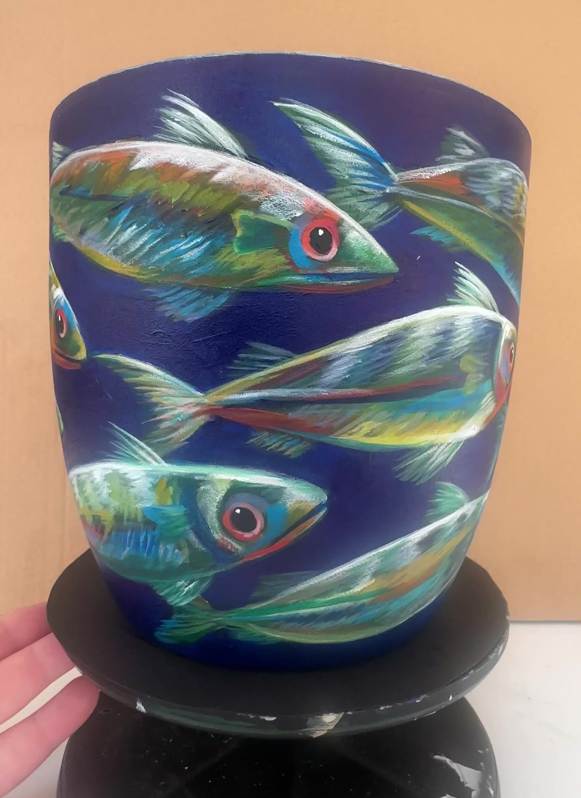 From Tracy Pritchard’s Little Shoal series — hand-painted ceramic vessels where schools of fish drift across deep, sea-toned surfaces.