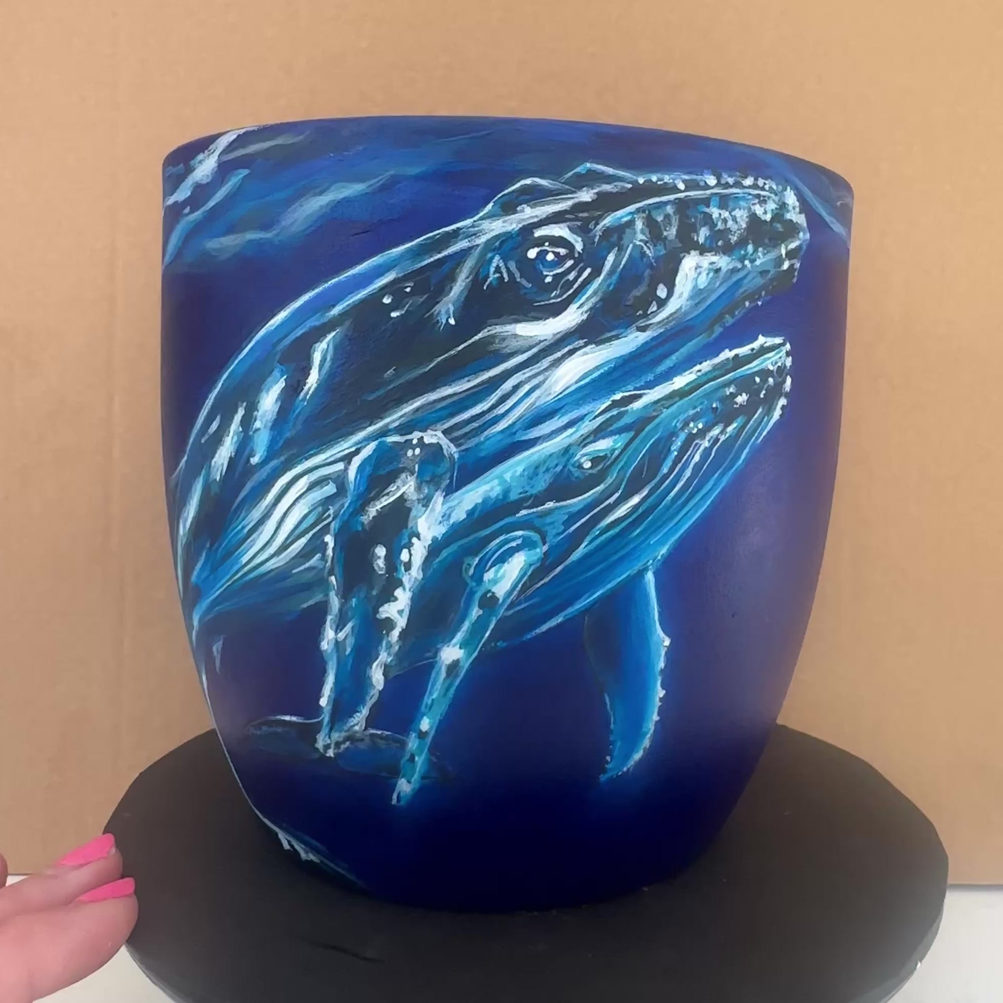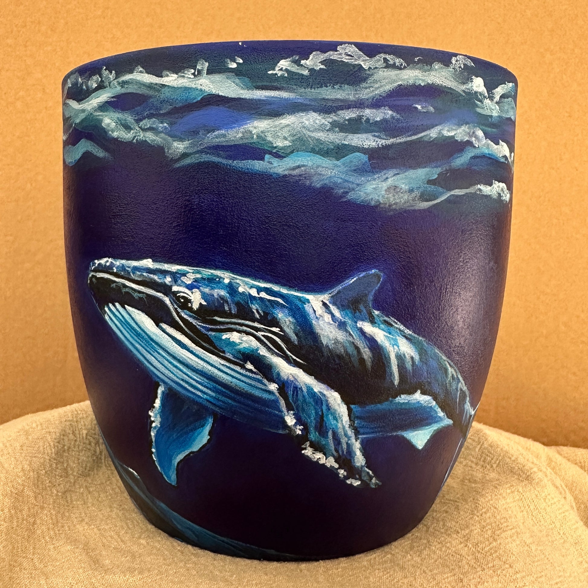 A dark, ocean-blue ceramic pot with a soft mid-blue interior, hand-painted with four whales — a mother and calf, a rising giant, from the depths, and a full-sized, majestic whale in motion. This one-of-a-kind piece captures the quiet power and grace of the sea. Painted in a range of beautiful blues, whites and greys, this piece is a collector’s item