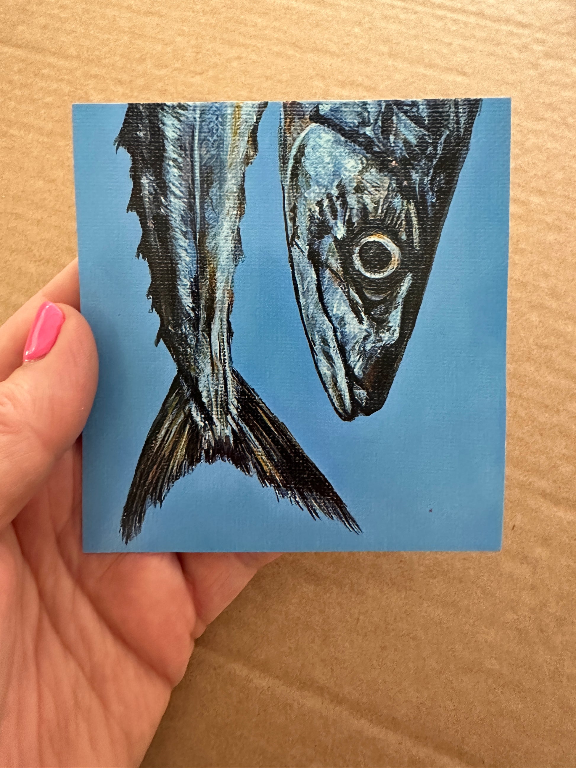 A surreal composition captured in print: the head and tail of a fish rest on a pale blue field. A moment suspended between motion and stillness, presence and absence.
