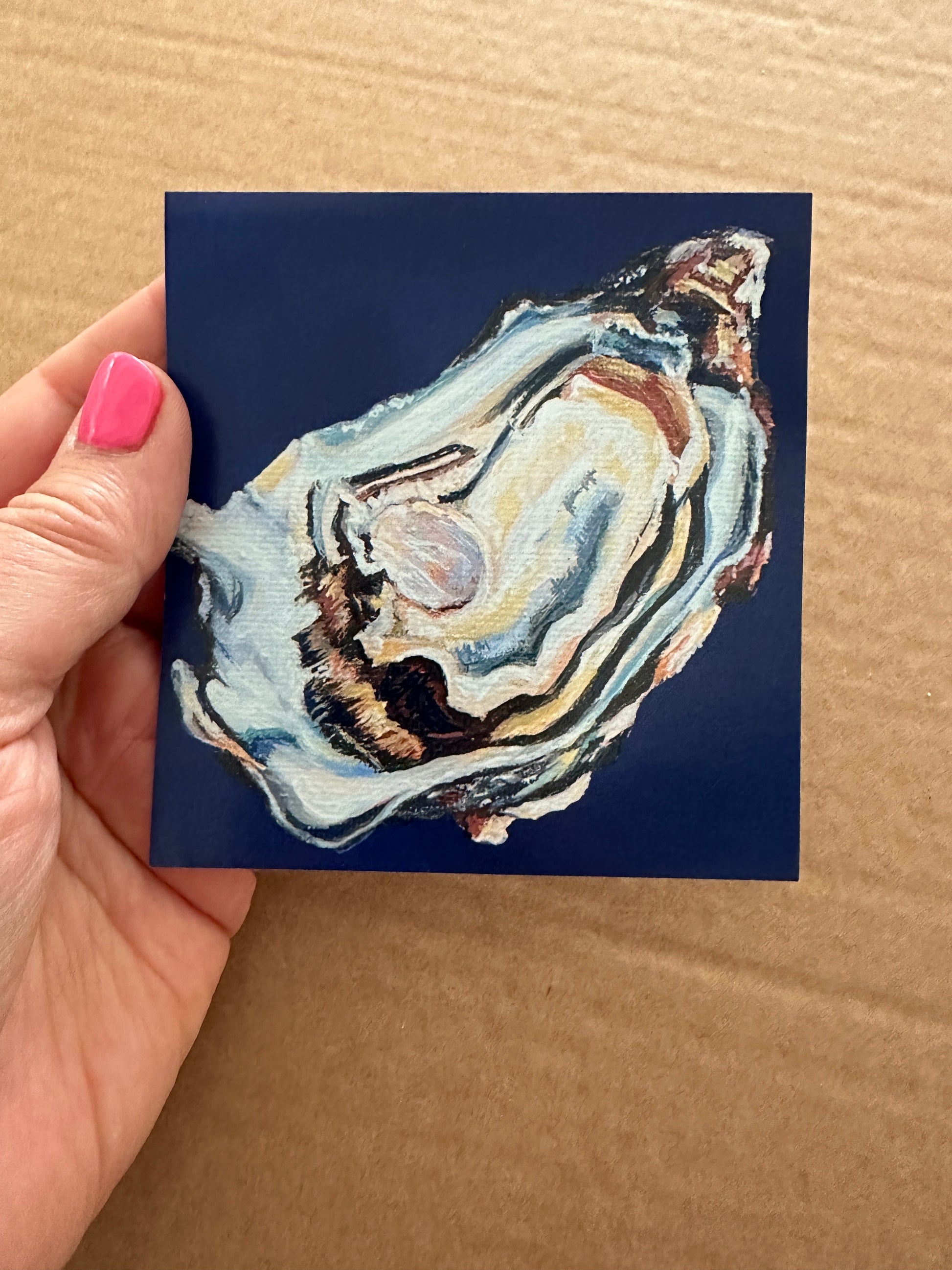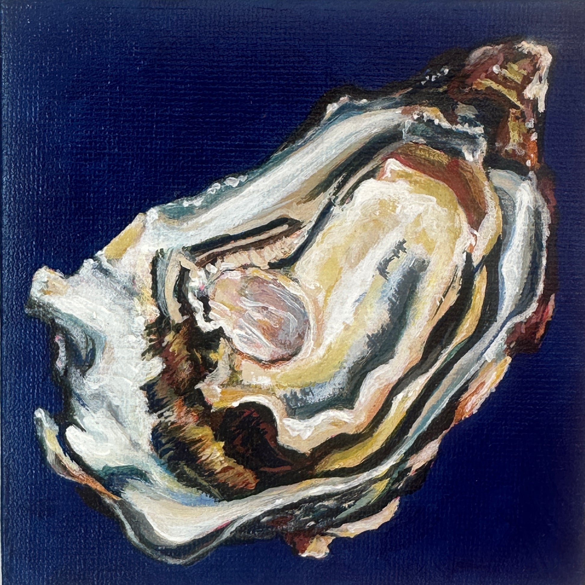 This fine art print captures a lone oyster resting on a deep navy sea. Gentle, glowing, and mysterious — it honours hidden beauty and softness within strong shells.