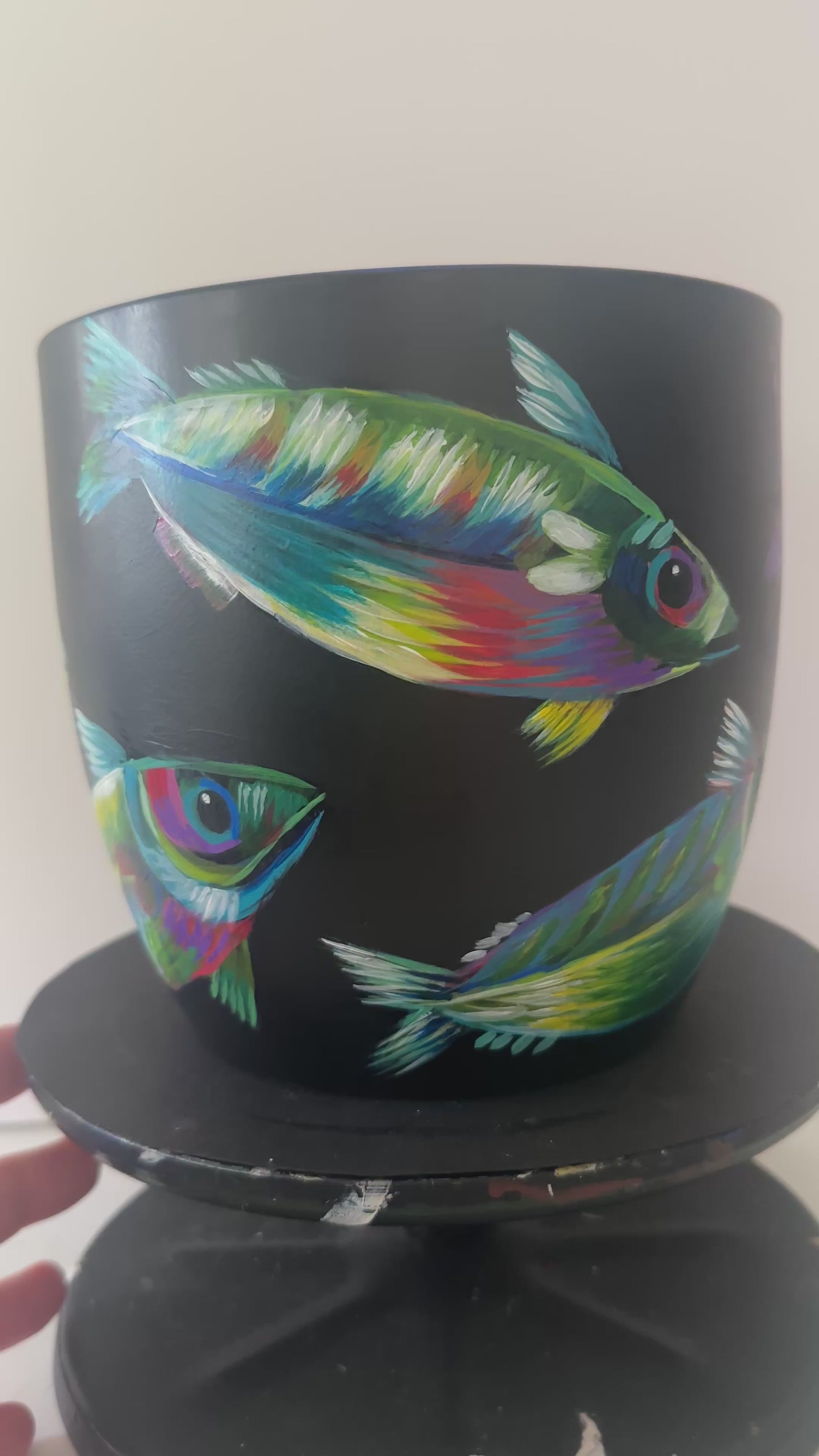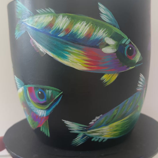 A sleek and elegant hand painted pot featuring a glistening shoal of 5 colourful fish gliding through a deep black sea. Brightly decorated with flashes of purple, red and yellow, making this fish pot pop playfully. A pretty purple rim finishes off the pot colourfully.