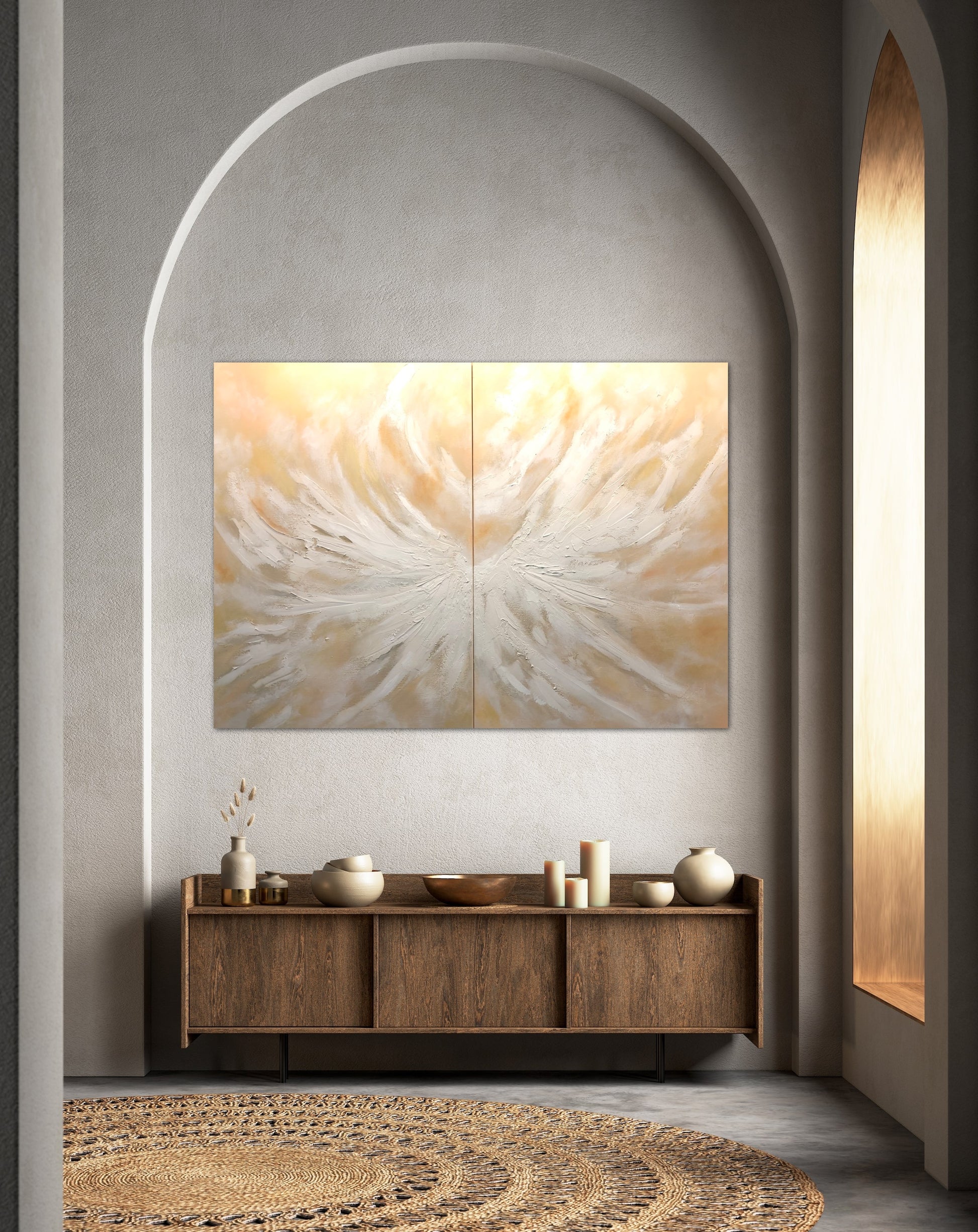 This is a diptych painting - 2 pieces which fit together, a mirrored pair with quiet strength. Soft folds of cream and blush rise like light through wings. Layers of texture catch the light, giving this painting a sense of movement and reverence.